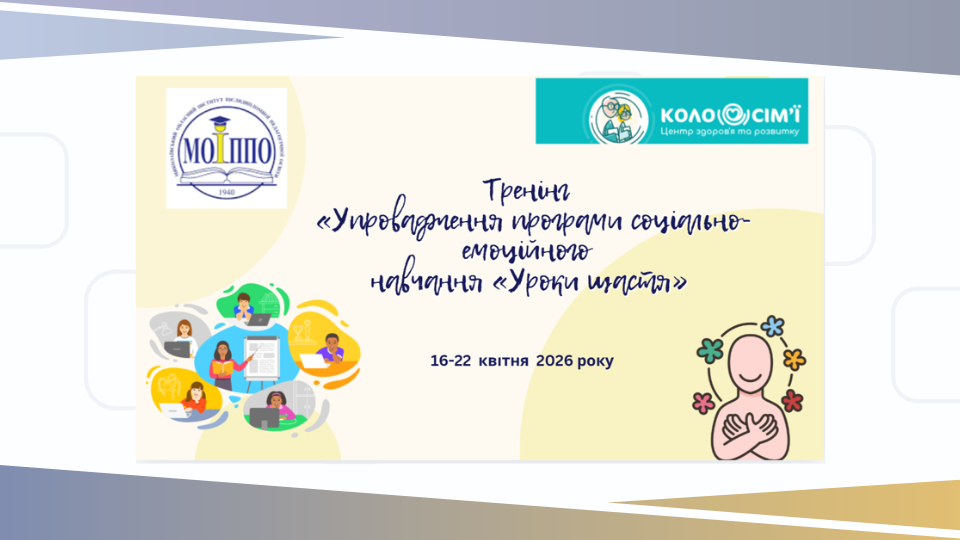 Із 16 до 22 квітня 2026 року навчально-методичною лабораторією акмеології спільно з навчально-методичною лабораторією практичної психології та соціальної роботи, кафедрою педагогіки, психології та менеджменту освіти МОІППО в дистанційному форматі проводитиметься тренінг «Упровадження програми соціально-емоційного навчання «Уроки щастя».