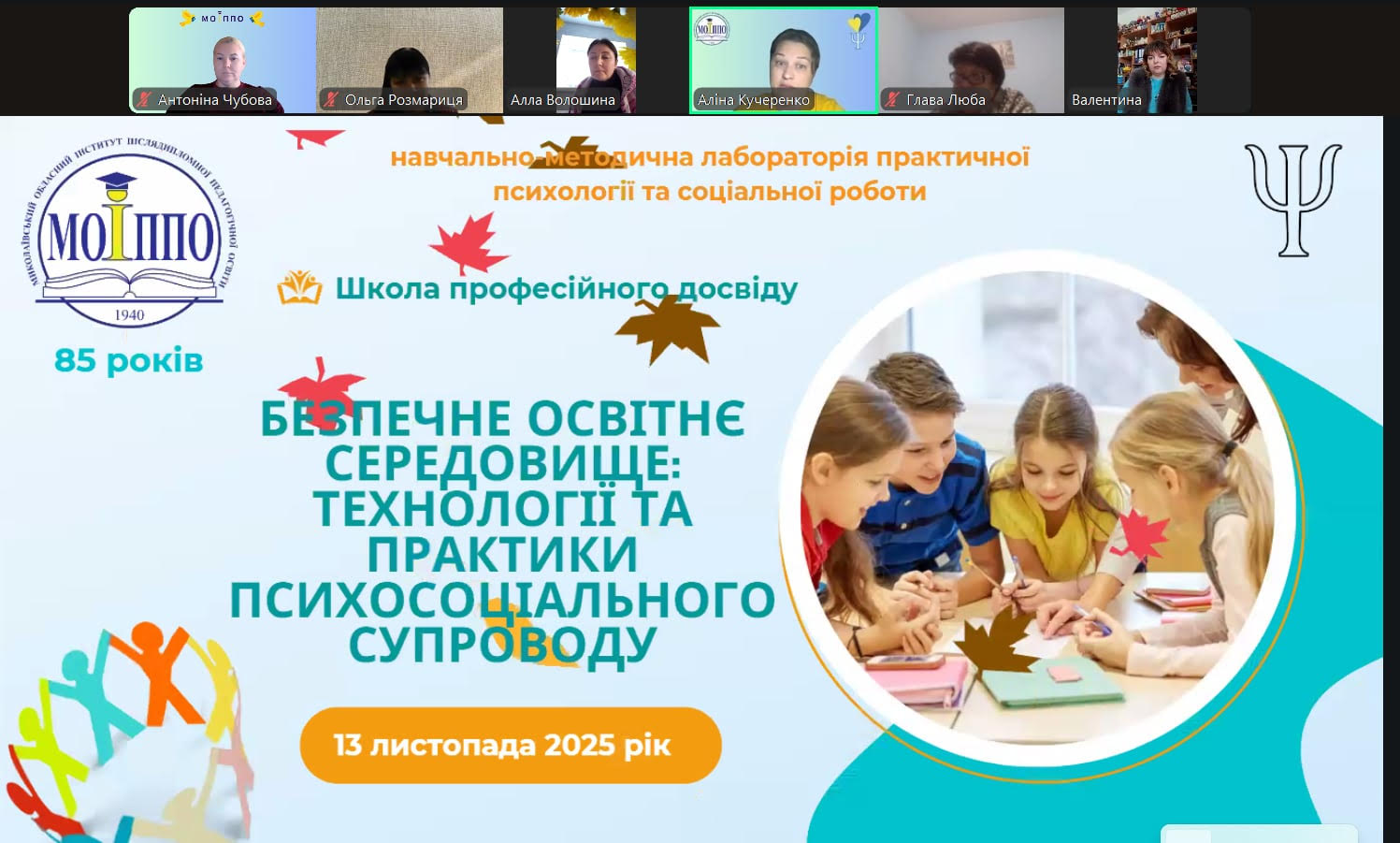 13 листопада 2025 року навчально-методичною лабораторією практичної психології та соціальної роботи МОІППО в режимі зум-конференції проведено Школу професійного досвіду для працівників психологічної служби закладів освіти Миколаївської області з теми «Безпечне освітнє середовище: технології та практики психосоціального супроводу».