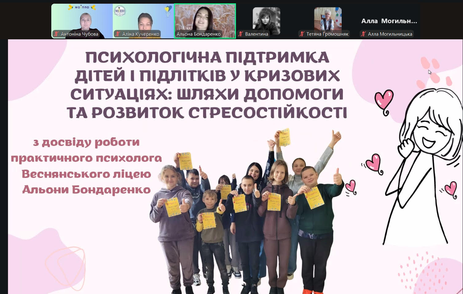 Альона Бондаренко, практичний психолог Веснянського ліцею з початковою школою та гімназією Веснянської сільської ради Миколаївського району, представила досвід підтримки дітей і підлітків у кризових ситуаціях та розвитку стресостійкості.
