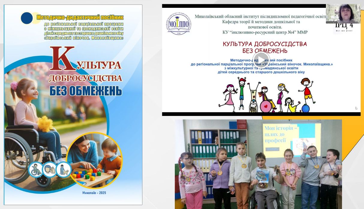 Наталя Літвінова, фахівчиня (консультантка) Комунальної установи «Інклюзивно-ресурсний центр № 4» Миколаївської міської ради, повідомила про додрукарську підготовку методично-дидактичного посібника «Культура добросусідства без обмежень» (авт.-уклад.: Олійник Л. М., Літвінова Н. Є.).
