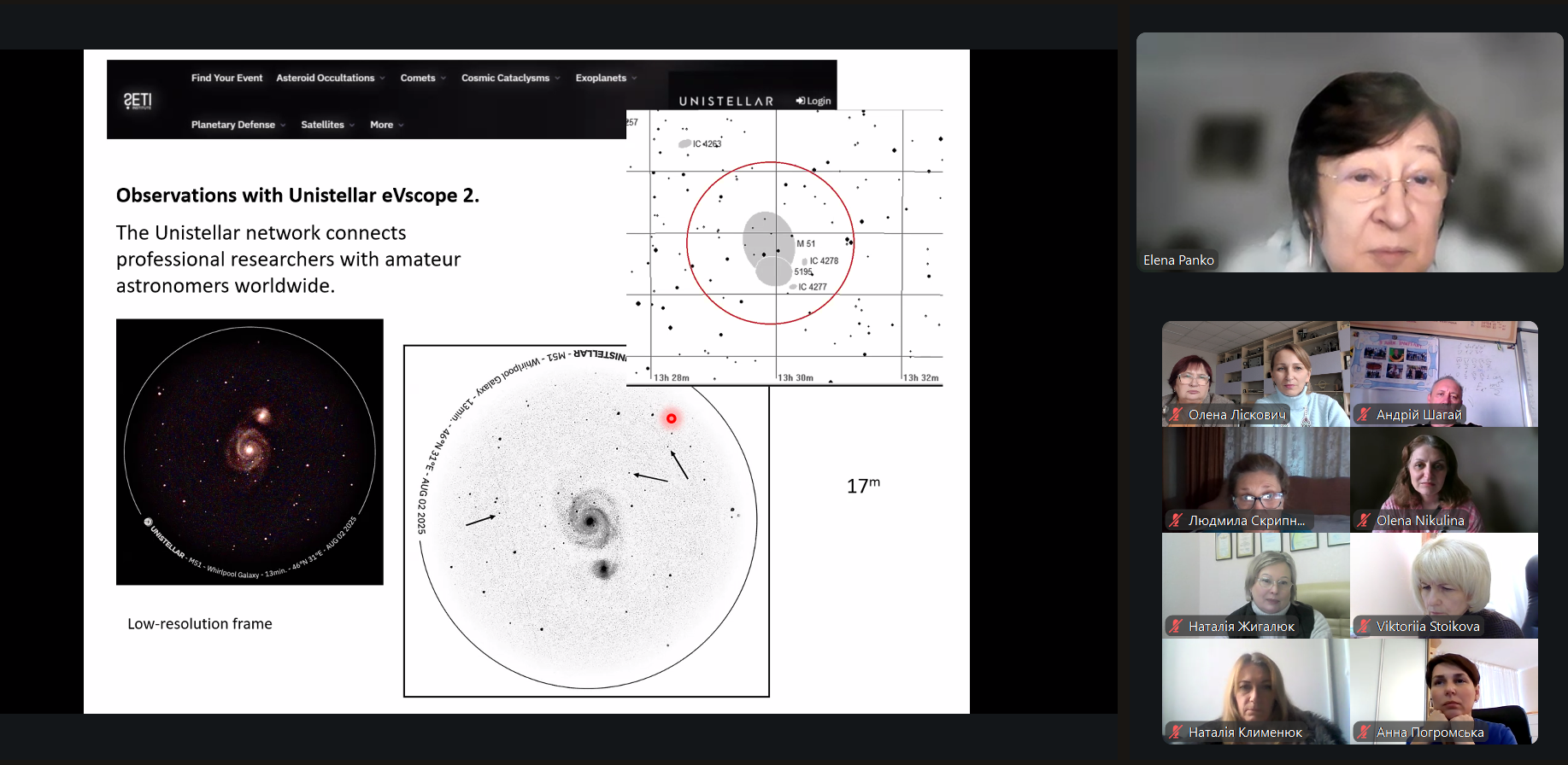 Олена Панько, д. ф.-м. н., професор, професор кафедри фізики та астрономії Одеського національного університету ім. І. І. Мечникова, ознайомила присутніх із сучасними відкриттями, що змінюють наше розуміння Всесвіту, зокрема розвіяла псевдонаукові домисли щодо штучного походження міжзоряного об’єкта 3I/ATLAS, ознайомила з можливостями телескопа Unistellar eVscope 2 для дослідження властивостей екзопланет, що можна провести з учнями чи студентами.