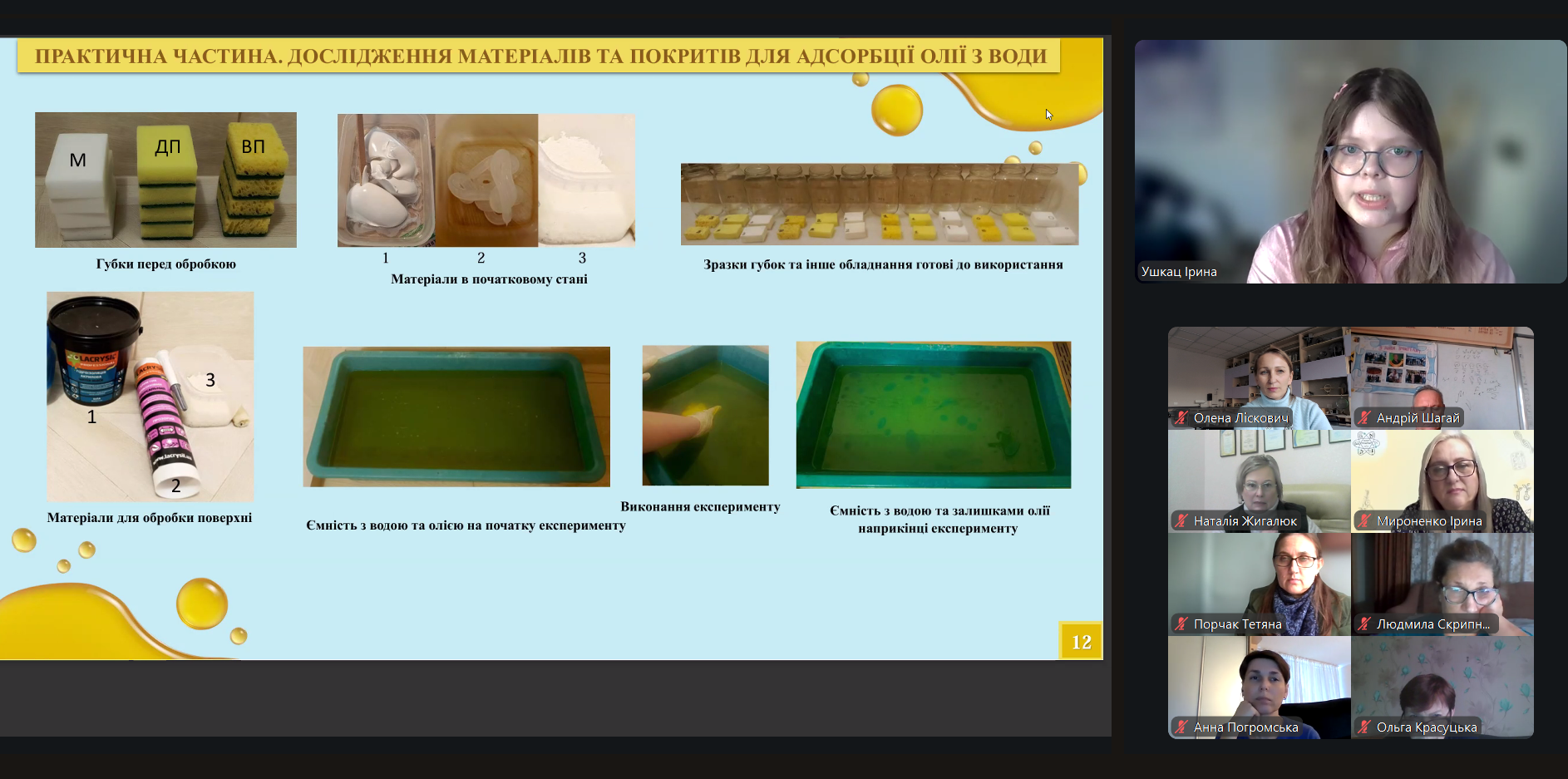 Результати пошуку шляхів вирішення проблеми подолання екологічних наслідків розливу рослинної олії презентували: Світлана Ушкац, к. ф.-м. н., доцент, доцент кафедри екології та природоохоронних технологій Національного університету кораблебудування імені адмірала Макарова, Ірина Ушкац, учениця 11 класу Миколаївського ліцею № 38 «Миколаївський колегіум» ім. В. Д. Чайки Миколаївської міської ради, переможниця (золота медаль) Міжнародної виставки винаходів «INOVA – 2025» (м. Загреб, Хорватія).