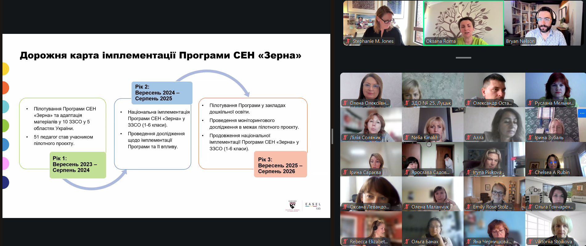 25 вересня 2025 року фахівці МОІППО: Стойкова В. В., Сокуренко О. О., Маланчук О. В. узяли участь у координаційній онлайн-зустрічі щодо реалізації пілотного проєкту «Програма СЕН «Зерна»: розвиток соціально-емоційних навичок та підтримка благополуччя дітей і педагогів в Україні». Програма СЕН «Зерна» упроваджується в межах Меморандуму про взаєморозуміння між Міністерством освіти і науки України та the LEGO Foundation у партнерстві з Лабораторією з екологічних підходів до соціально-емоційного навчання Гарвардської вищої школи освіти.
