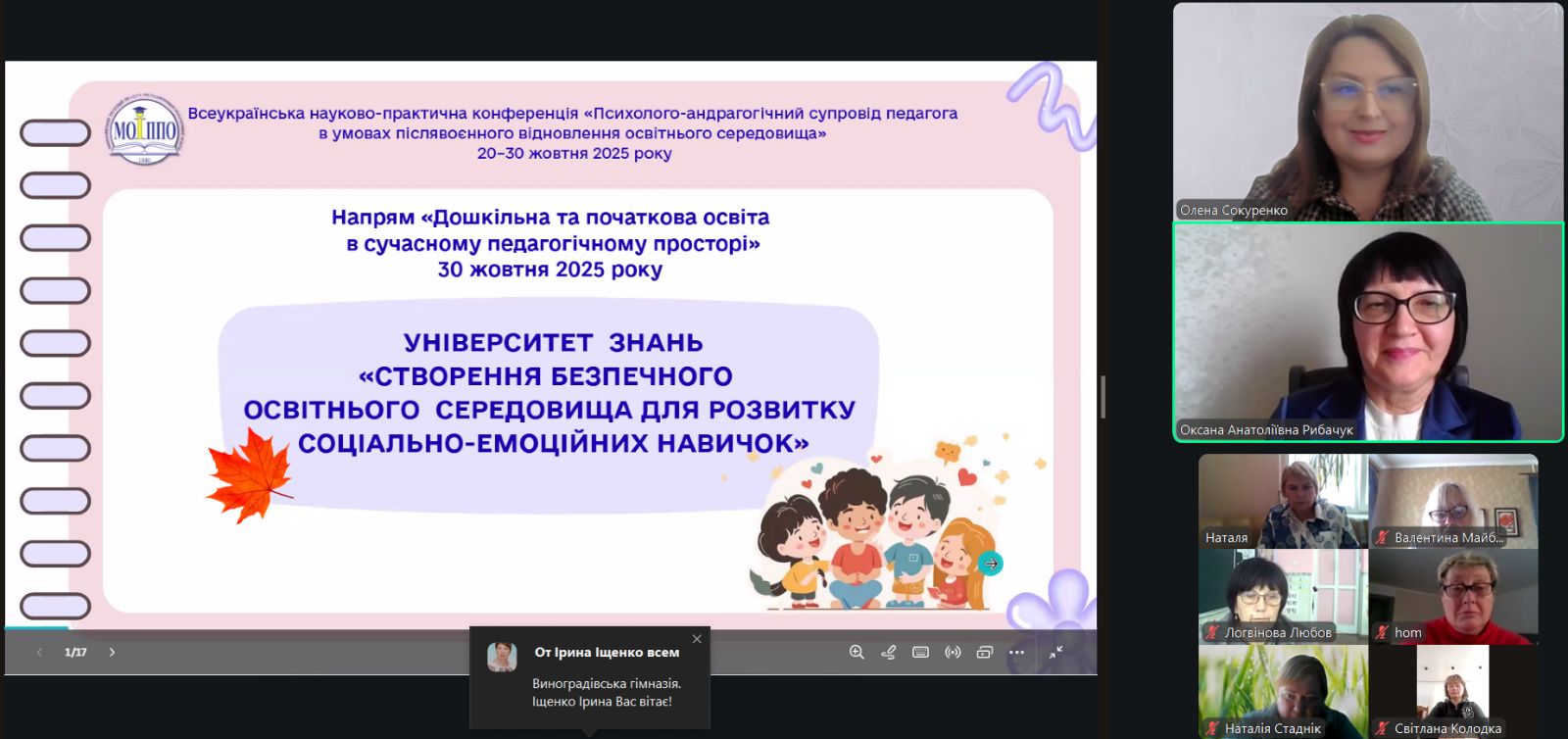 Олена Сокуренко, завідувач кафедри теорії й методики дошкільної та початкової освіти МОІППО, привітала учасників, наголосила на важливості зустрічей, під час яких розглядаються питання з роботи початкової школи в сучасних умовах, що потребують нових підходів до навчання і виховання здобувачів освіти, здійснюється обмін досвідом щодо розвитку соціально-емоційних навичок молодших школярів учителями-практиками.
