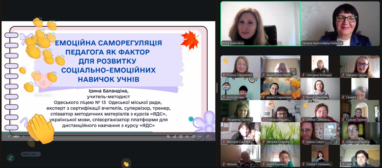 Ірина Баландіна, учитель-методист Одеського ліцею № 13 Одеської міської ради, експерт із сертифікації вчителів, супервізор, тренер, співавтор методичних матеріалів з курсів «ЯДС», української мови, продемонструвала прийоми емоційної саморегуляції педагога як фактора для розвитку соціально-емоційних навичок учнів.