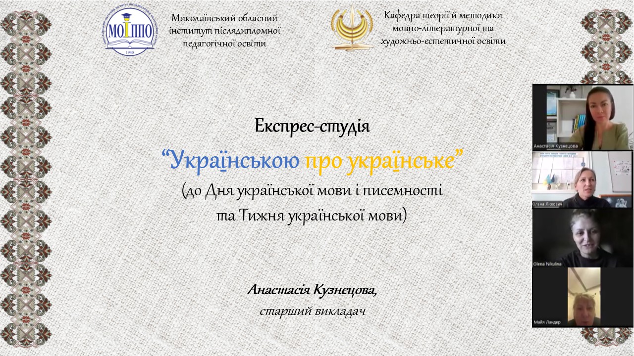 30 жовтня 2025 року в межах Тижня української мови Анастасія Кузнєцова, старший викладач кафедри теорії й методики мовно-літературної та художньо-естетичної освіти МОІППО, провела експрес-студію “Українською про українське” для науково-педагогічних і педагогічних працівників закладу. Захід відбувся в дистанційному форматі (синхронно) із трансляцією на ютуб-каналі інституту, що дало можливість долучитися до нього освітянам Миколаївщини.