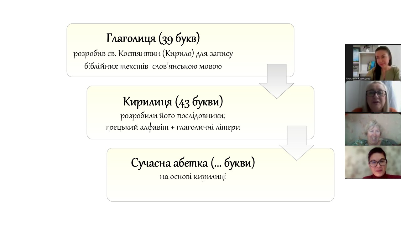 Учасники студії, присвяченої Дню української писемності та мови, пригадали витоки української абетки, обговорили її колоритні й символічні букви, виконавши низку інтерактивних практичних завдань: інтелект-руханку “Напишіть очима…”, “Пам’ятаймо Ї”, “Розрізняймо пароніми”, “Наголошуймо украЇнське”, швидкотест “Г / Ґ”, “Співпрацюймо” (редагування текстів, написаних штучним інтелектом), “Вправляймося з чистомовками”, рефлексійну руханку.